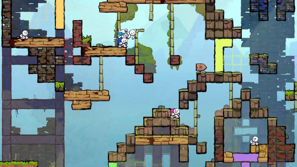 بازیش کاملا همکاری و اصطلاحا «همیاری» میگم. بدون کمک همدیگه هیچکاری نمیتونید بکنید. بازی به اینصورته که وقتی افراد رو جمع میکنید، به شما میچسبند و بلوکها چندتایی تشکیل میدید که میتونه برای بالا رفتن خیلی کمک کنه. شما نمیتونید ترتیب قرار گرفتن افراد رو تغییر بدید و شکلهای جدید بسازید اما هر مرحله این شکلها تغییر میکنند.